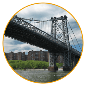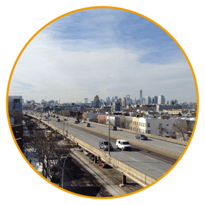 Take the Bridge to the end. At the traffic light, make a left onto Tillary Street. After a few blocks you will see the entrance ramp to the Brooklyn Queens Expressway (BQE) rise in front of you. Don’t take it. Instead, bear right and continue on Tillary Street. After the next light Tillary becomes Park Avenue. Continue on Park Avenue and make a left at Clinton Avenue. Take Clinton Avenue into the Navy Yard.